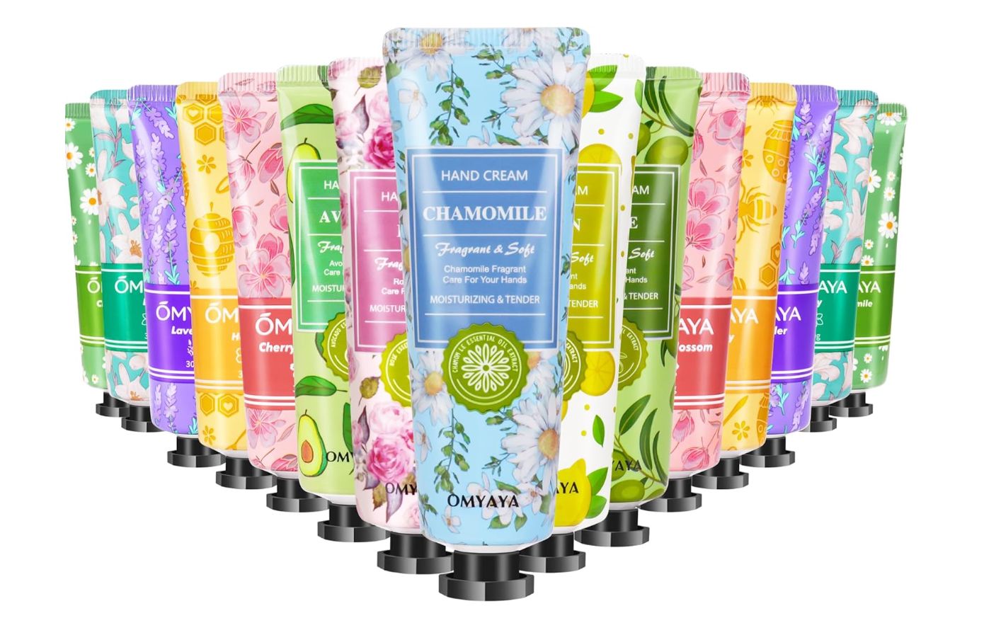 โจ Set de regalo con 15 mini cremas de manos de absorciรณn rรกpida enriquecidas con glicerina, vitamina E y esencias frutales y florales, diseรฑadas para hidratar intensamente y suavizar la piel seca o agrietada sin dejar sensaciรณn grasa