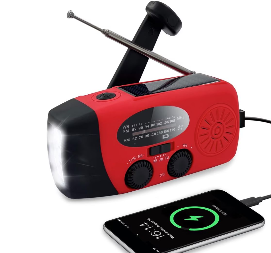 โจ Radio AM/FM NOAA con carga solar, manivela y USB, linterna LED, alarma SOS y funciรณn powerbank 2000 mAh