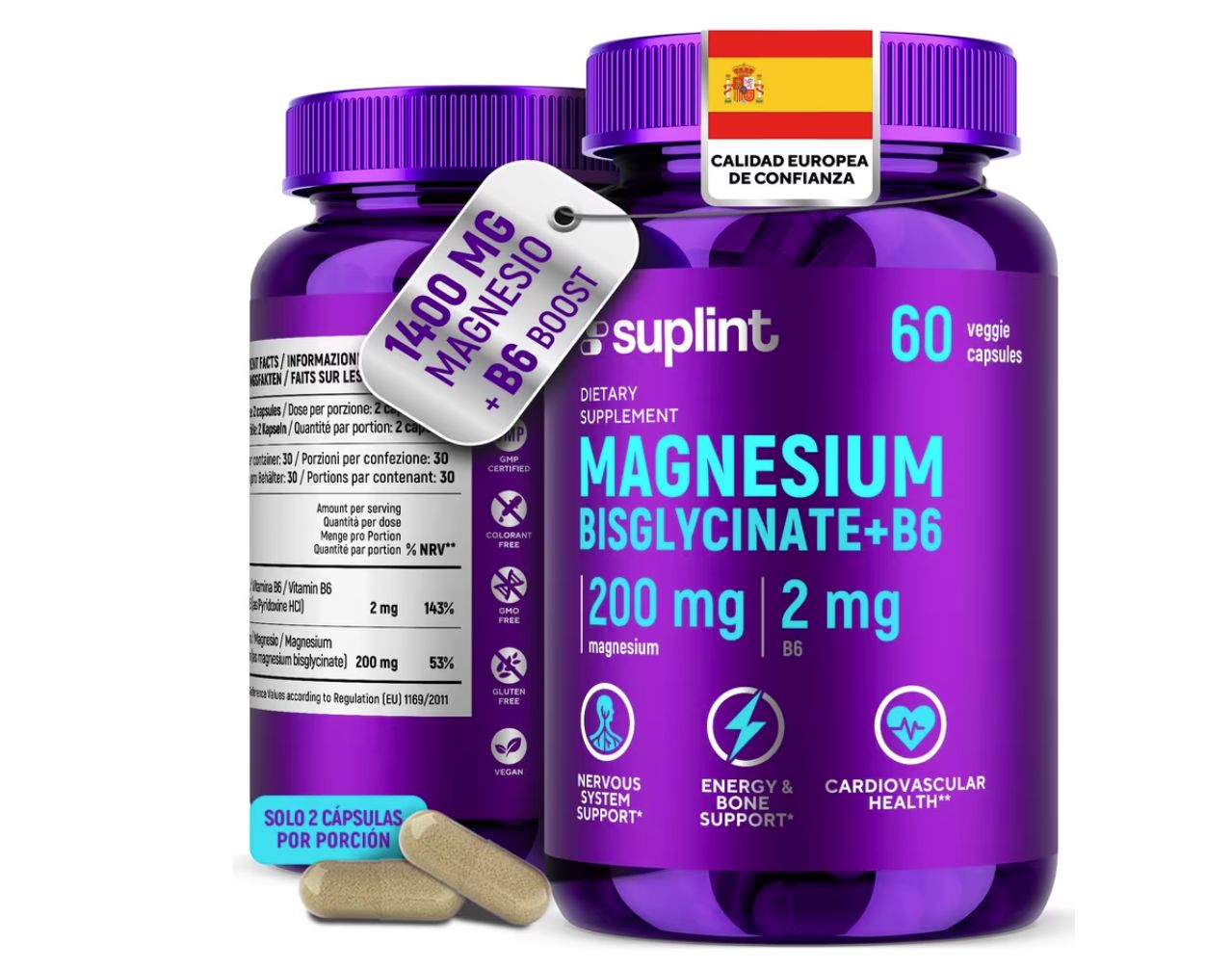 ๐ Pack 60 Caps Bisglicinato de Magnesio Cรกpsulas 200 mg con Vitamina B6, Magnesio Bisglicinato, Vegano sin Aditivos. #Amazon
