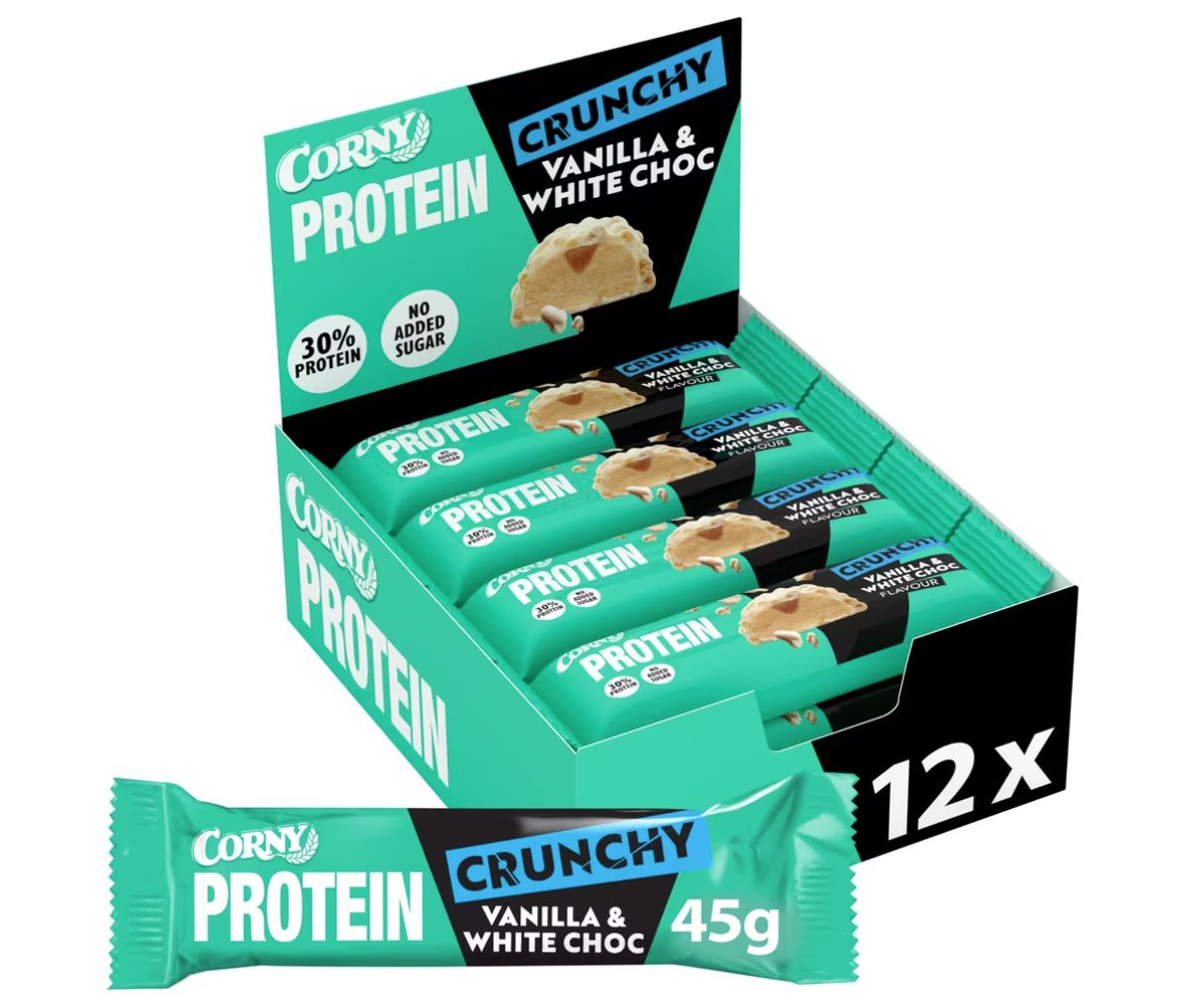 ๐ Pack 12 Barritas de Proteรญnas, Corny Protein, Crunchy Chocolate Blanco Sabor Vainilla, 13,5 gr de Proteรญnas, 0% Azรบcares Aรฑadidos, 45 g. #Amazon