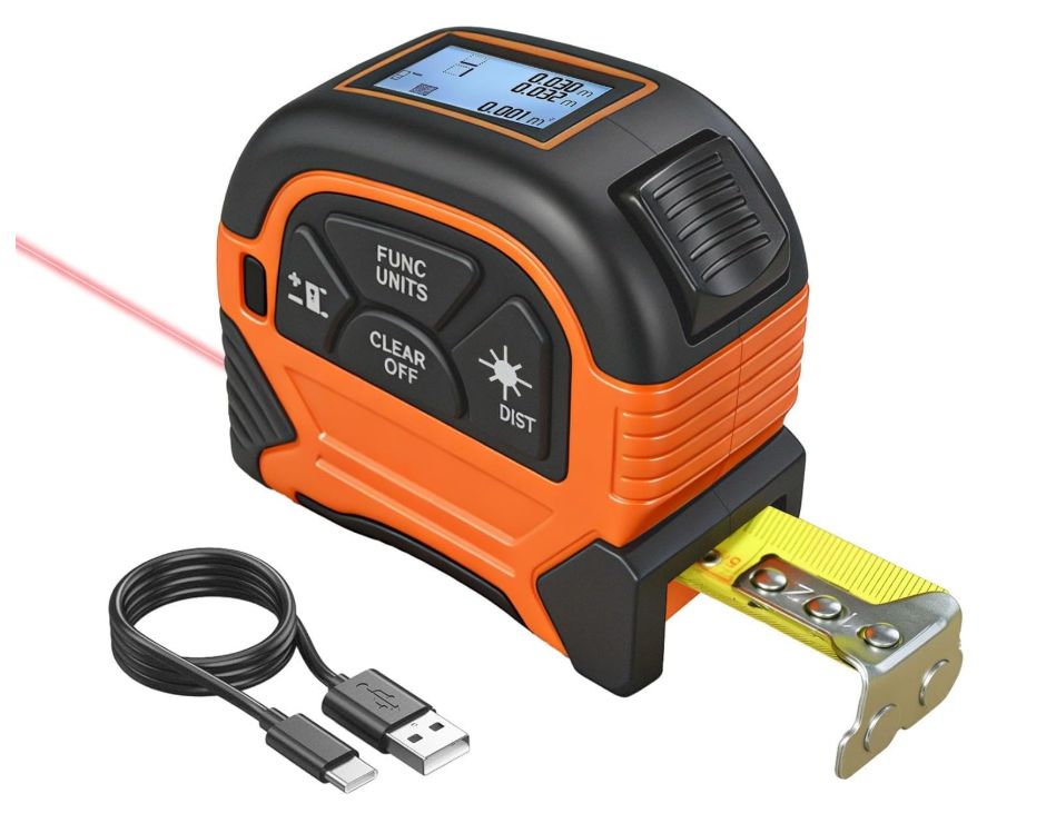 ✨ Dispositivo híbrido recargable mediante USB-C que combina medidor láser de largo alcance con cinta métrica convencional de gancho magnético incluyendo seis modos de medición de alta precisión y pantalla retroiluminada