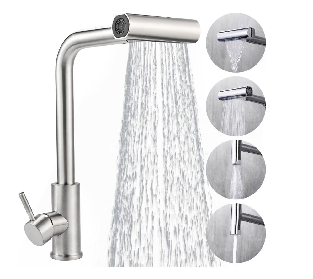 ✨ Monomando giratorio de 360° con manguera extensible de hasta 50 cm y 4 modos de rociado que incluye una boquilla de cascada rotativa para una limpieza eficiente sin salpicaduras
