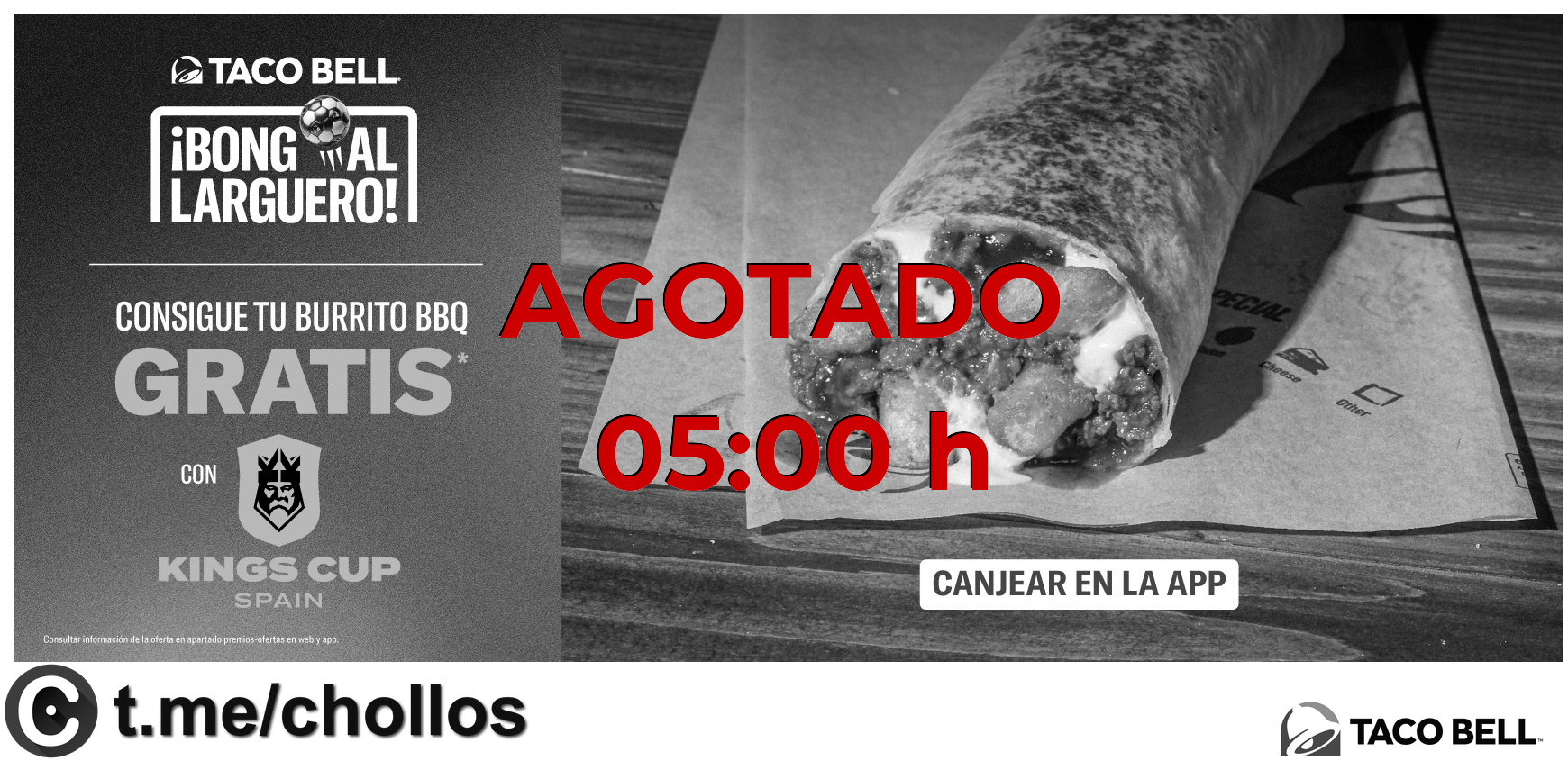 ✨Nueva promoción en Taco Bell donde nos llevamos totalmente gratis un burrito BBQ Kings League valorado en 1,99€, podemos usar el cupón en app para recogida con Click & Collect o utilizar directamente en kiosko en todos los restaurantes adheridos a la promoción.
