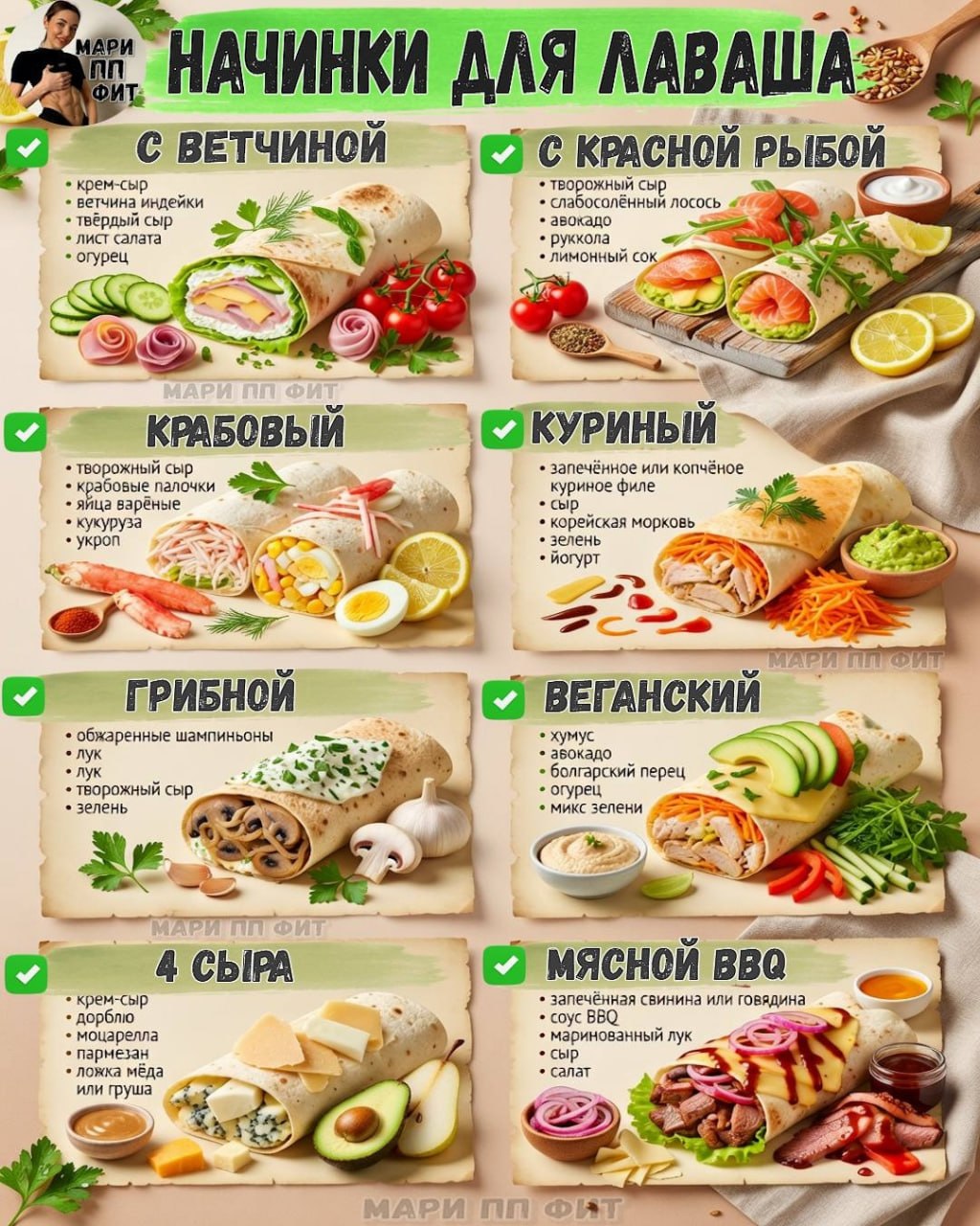 Лаваш — ваш топ помощник. Тонкий, без дрожжей — это чистые углеводы-долгоиграйки + клетчатка (лучше выбирать цельнозерновой!).