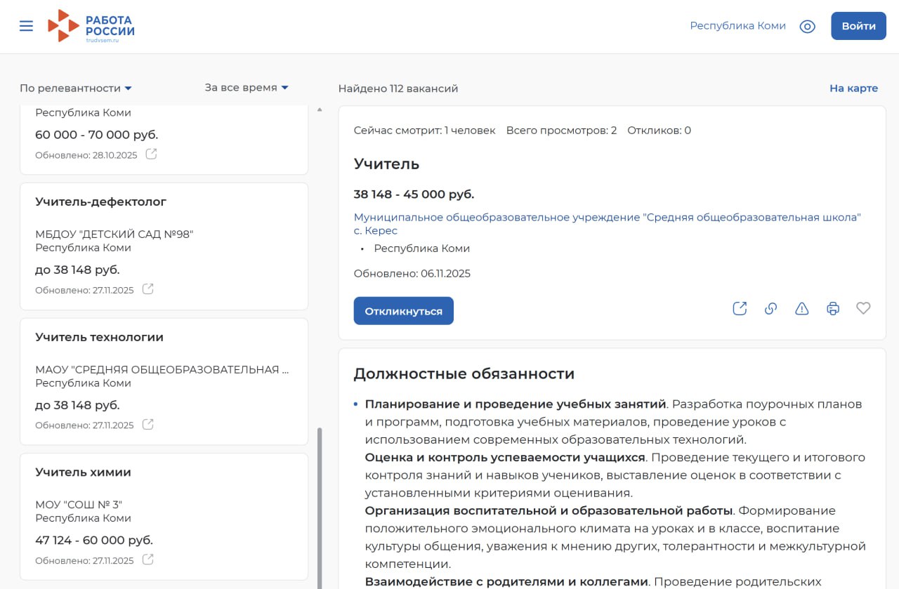 Наши читатели подсказывают, что надо просто зайти на сайт Работа России и посмотреть, какие есть вакансии по слову учитель в Республике Коми. В целом всё так, как и озвучили на сессии Госсовета, но есть и больше. Самое интересное, что нам удалось отыскать вакансию учителя за 38 000 рублей.