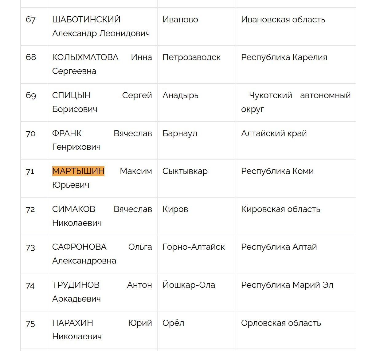 Сыктывкар в рейтинге представляет Максим Мартышин, который занял 71-е место, поднявшись на одну позицию по сравнению с прошлым исследованием, где у него было 72-е место.
