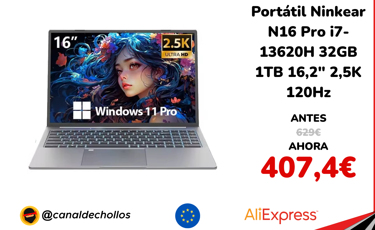 🔹 Portátil Ninkear N16 Pro i7-13620H 32GB 1TB 16,2" 2,5K 120Hz solo 407,4€ ❗️💥 (PVP: 629€)
