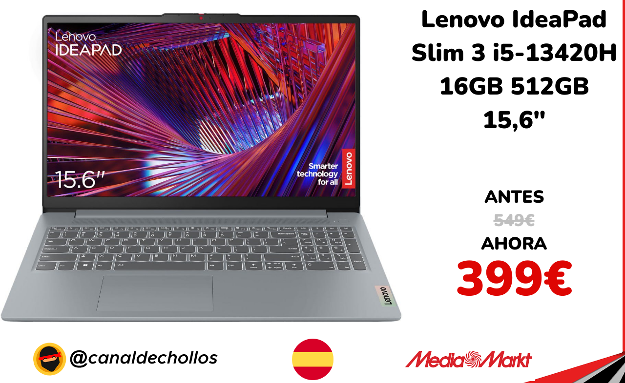 🔹 Lenovo IdeaPad Slim 3 i5-13420H 16GB 512GB 15,6" solo 399€ ❗️💥 (PVP: 549€)