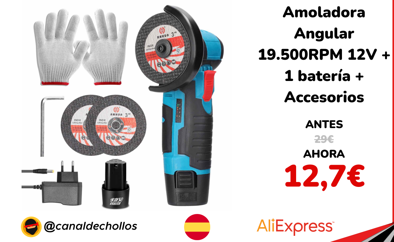 🔹 Amoladora Angular 19.500RPM 12V + 1 batería + Accesorios solo 12,7€ ❗️💥 (PVP: 29€)
