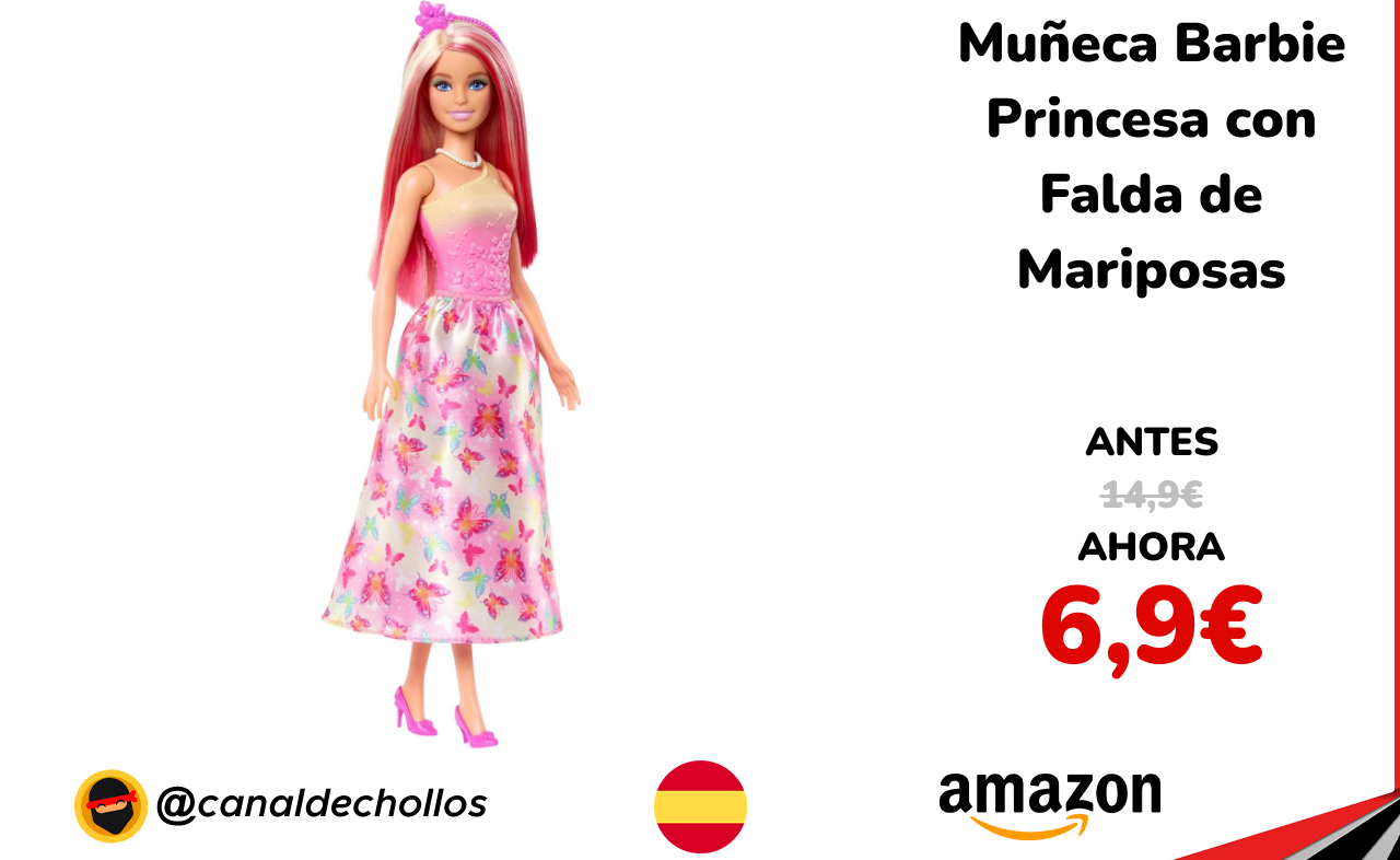 ✨ Precio chollito para esta muñeca Barbie modelo Princesa con falda rosa estampada de mariposas, diadema y zapatos incluidos. Mide aproximadamente 30cm de alto y presenta cabello con reflejos de colores y falda con diseño detallado. Ideal como regalo para los peques de la casa y coleccionistas. Vendido y enviado por Amazon.
