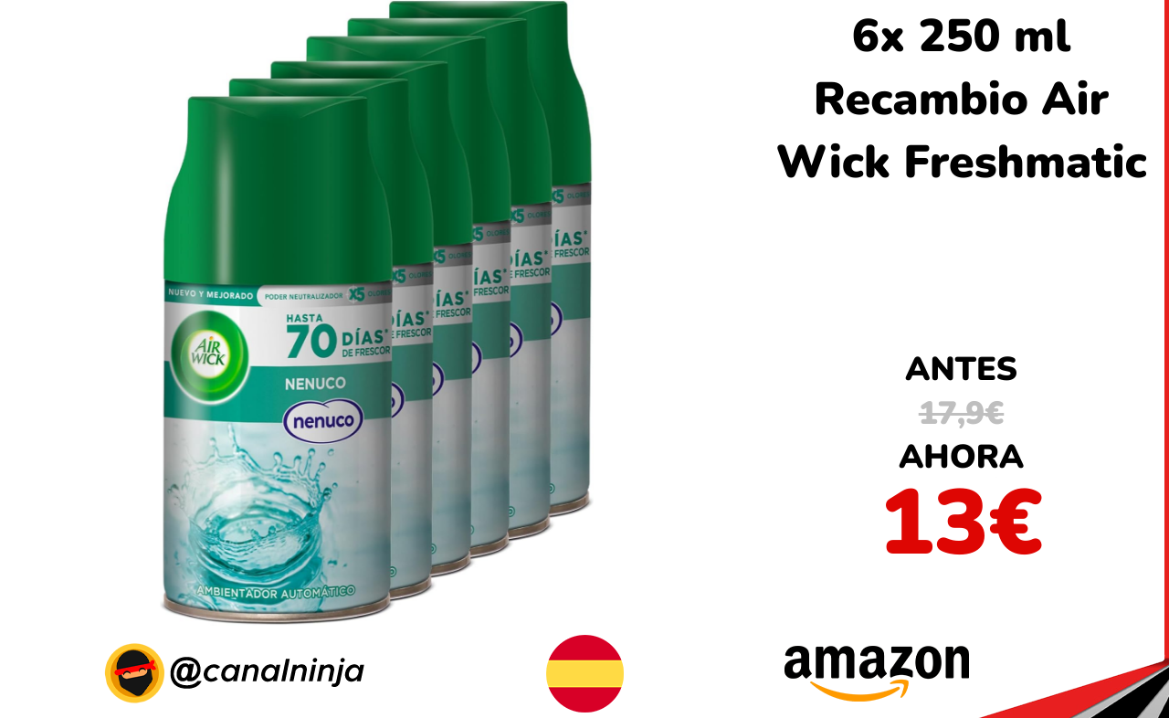 ✨ Muy buen descuento para este pack de 6 recambios Air Wick Freshmatic con aroma Nenuco. Ambientador spray automático que elimina olores y perfuma de forma continua hasta 70 días por recambio. Intensidad regulable, fragancia fresca y limpia ideal para cualquier estancia del hogar.