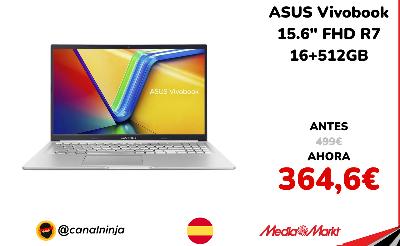 🔹 ASUS Vivobook 15.6" FHD R7 16+512GB solo 364,6€ ❗️⚔️️ (PVP: 499€)