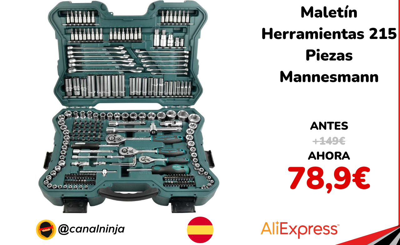✨ Cupón dto. para este maletín de herramientas Mannesmann, que incluye 215 piezas, entre las que te encontrarás con llaves de vaso, carracas reversibles, vasos cortos y largos, alargaderas, puntas bits, y adaptadores, todo en acero cromo vanadio resistente. Un set perfecto para los manitas del hogar el ideal para mantenimiento de tu vehículo. Envío GRATIS.