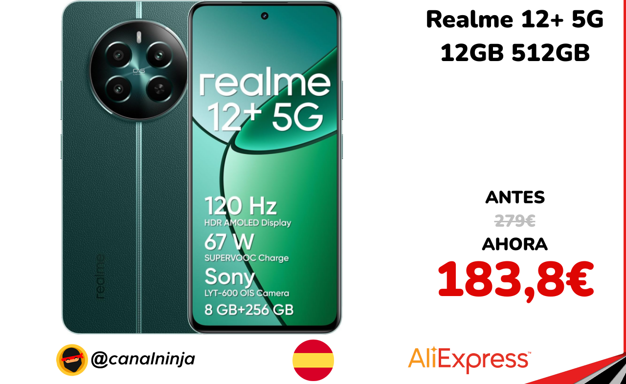 🔹 Realme 12+ 5G 12GB 512GB solo 183,8€ ❗️⚔️️ (PVP: 279€)