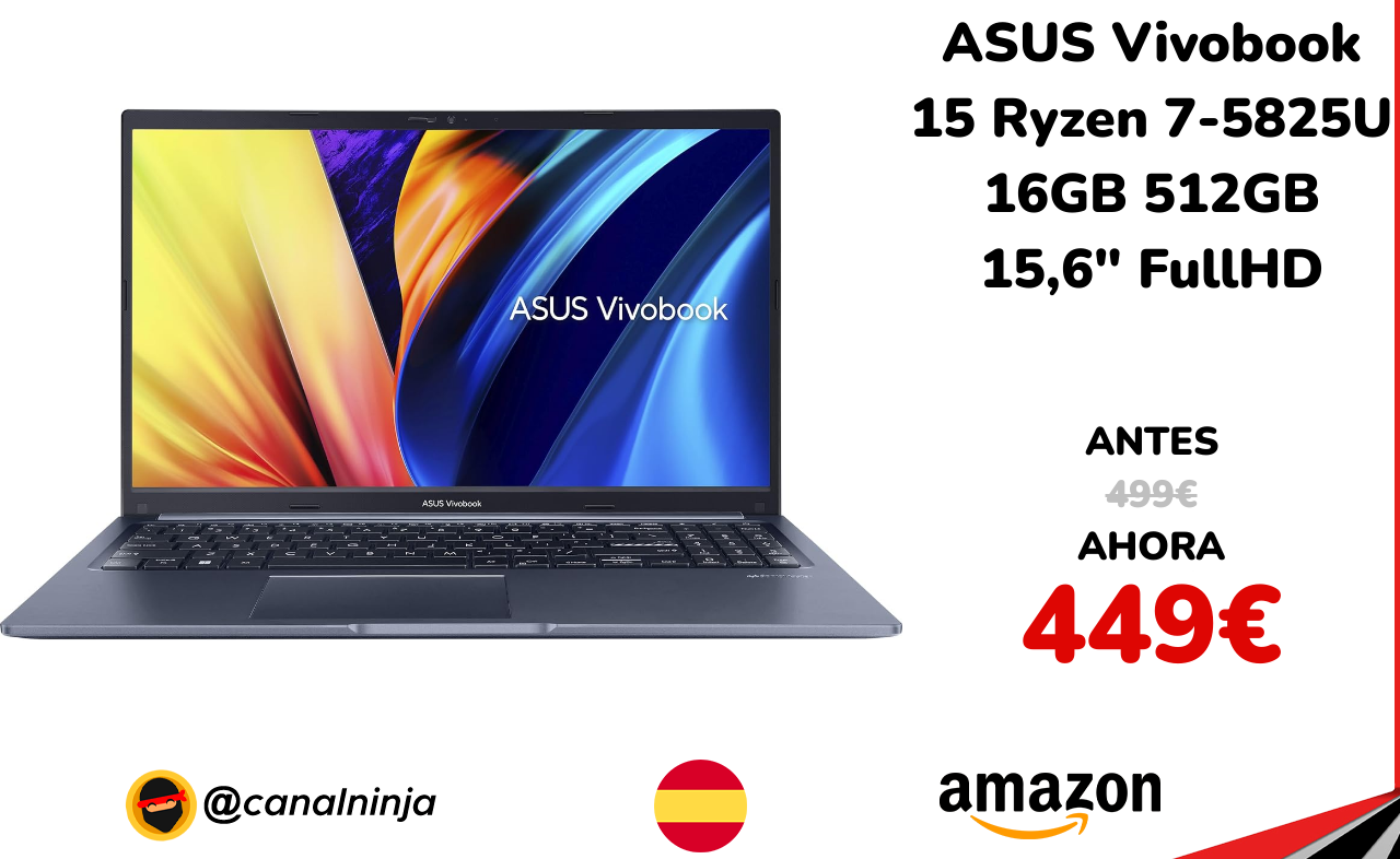 🔹 ASUS Vivobook 15 Ryzen 7-5825U 16GB 512GB 15,6" FullHD solo 449€ ❗️⚔️️ (PVP: 499€)