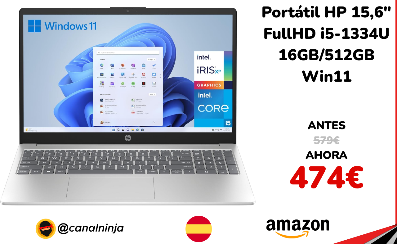 🔹 Portátil HP 15,6" FullHD i5-1334U 16GB/512GB Win11 solo 474€ ❗️⚔️️ (PVP: 579€)
