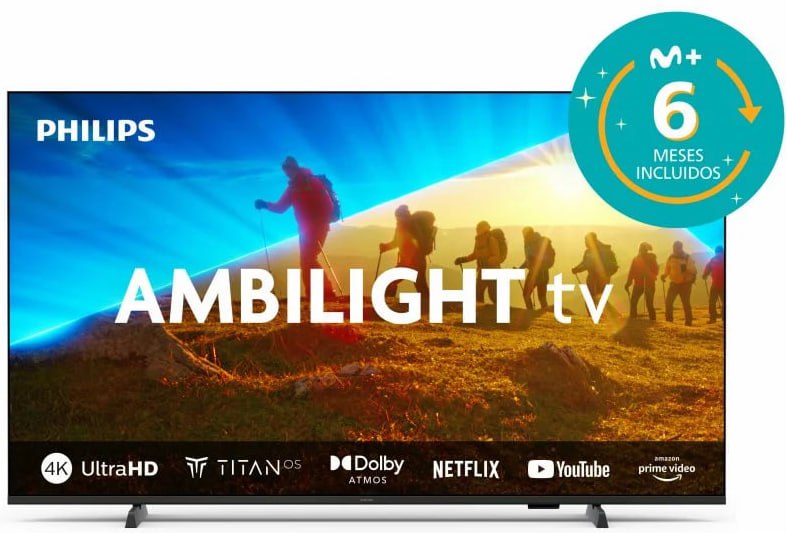 ✨ Oferta en esta Smart TV Philips de 50" con iluminación de ambiente Ambilight integrada y tecnología HDR10+, sonido Dolby Digital, y cuenta con conexiones como WiFi, Bluetooth, 3xHDMI, 2xUSB, Antena RF y SAT, ranura CI+, ethernet RJ45, y salida de audio SPDIF óptica. Titan OS como Sistema Operativo. Incluye promoción de 6 meses de Movistar Plus. Envío GRATIS.