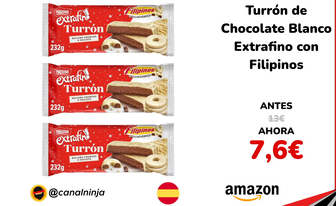✨ Oferta para este pack de 3 tabletas de 232 g cada una de turrón extrafino de chocolate blanco con relleno de galleta Filipinos ofrece una combinación irresistible de suavidad y crujiente de marca NESTLÉ. Elaborado con chocolate blanco cremoso y trozos de galleta, es perfecto para compartir en Navidad o como dulce especial. Vendido y enviado por Amazon.
