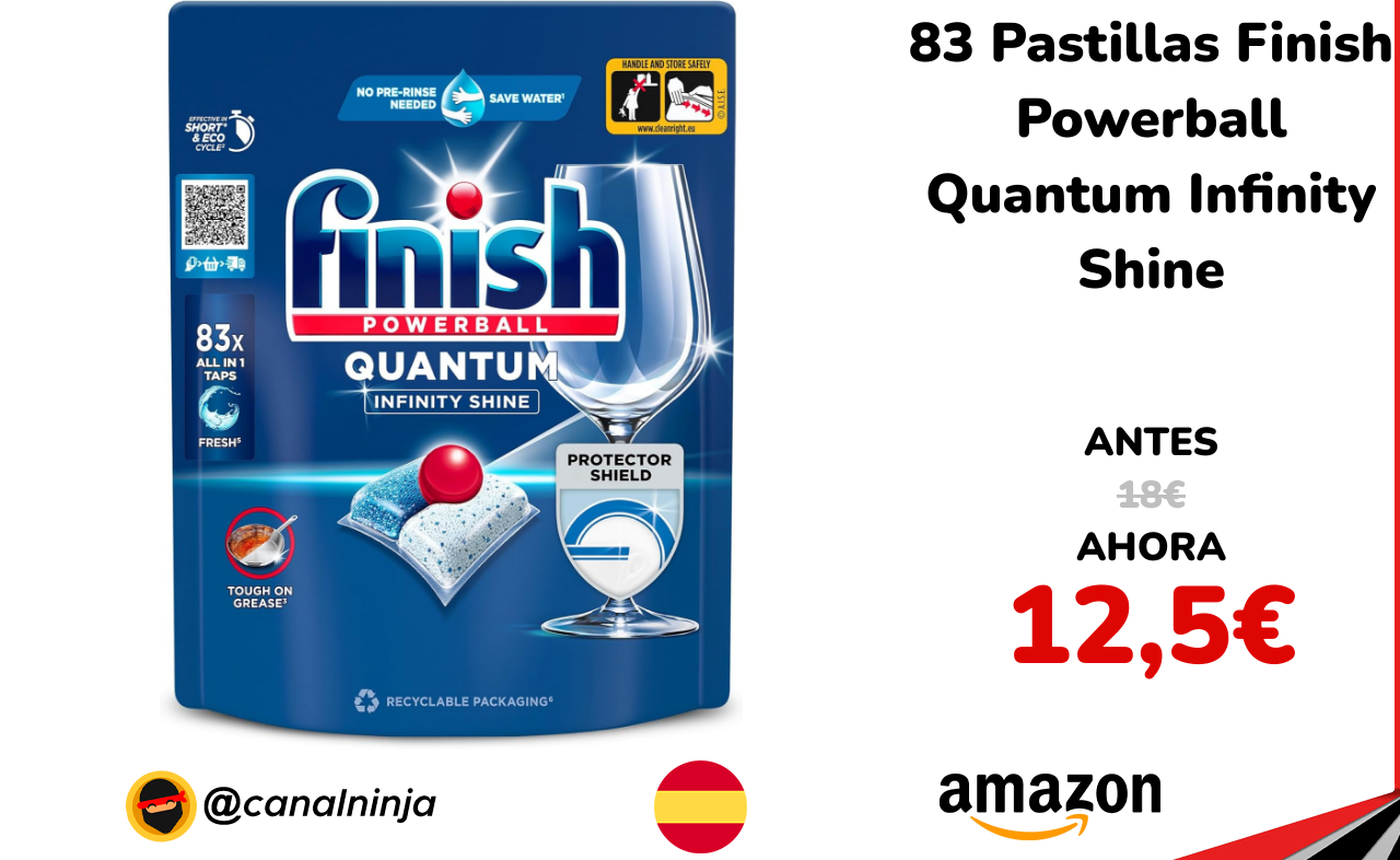 ✨ Buen precio para este pack de 83 pastillas de lavavajillas Finish Quantum Infinity Shine. Su fórmula con polvo desincrustante y gel con poder quita grasas, acaba con todo tipo de suciedad. Además, tiene 16 power actions para ofrecer una limpieza y brillo a tu vajilla que solo Finish puede darte. Así mismo, gracias a la tecnología Activblue no necesitas pre-lavar los platos. Vendido y enviado por Amazon.