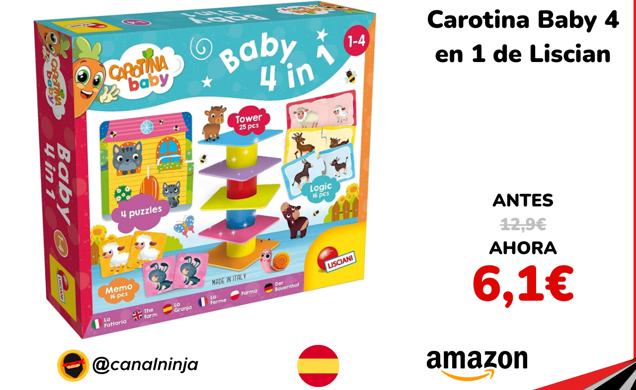 ✨ Muy buen descuento para este set educativo Carotina Baby 4 en 1 de Lisciani, ideal para niños de 2 a 4 años. Incluye torre de equilibrio, juegos de memoria y lógica, y puzzles de animales. Desarrolla motricidad fina, pensamiento lógico y memoria.