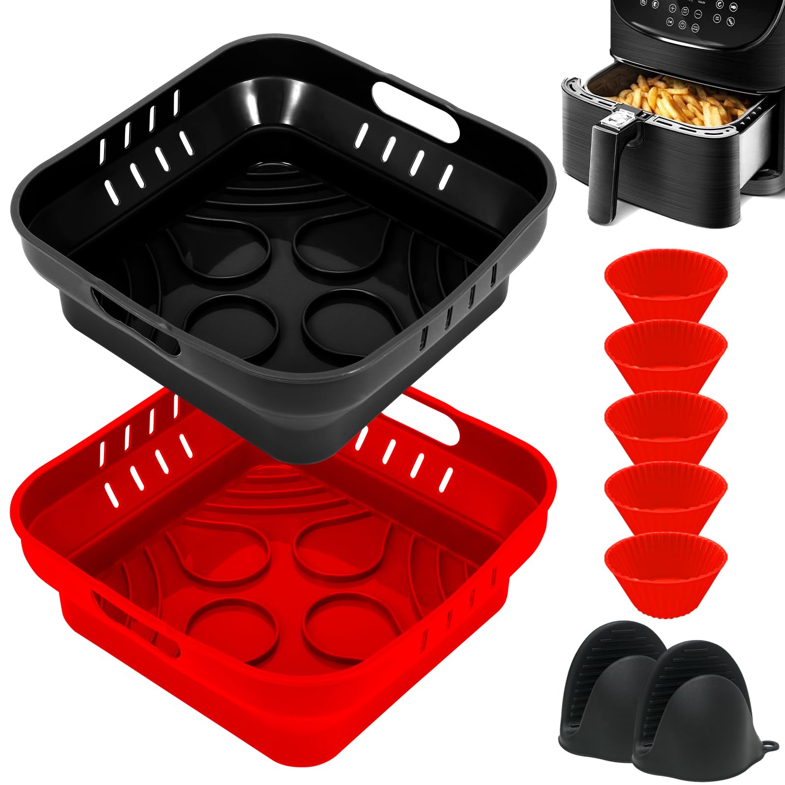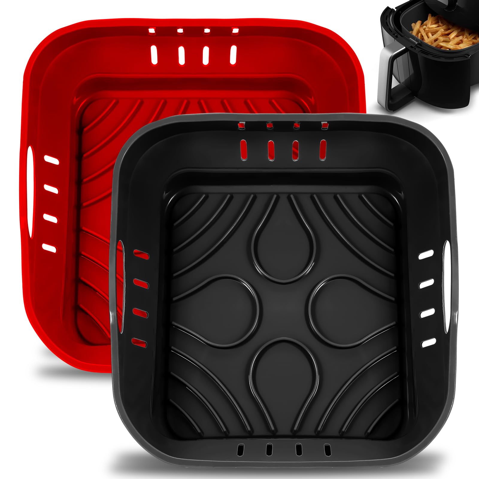 ✴️Moleath 22cm Molde Silicona Freidora de Aire, 2 PCS Accesorios Freidora sin Aceite - Cesta Cuadrada de Silicona XXL para COSORI 5,5L, Cecotec 6L Airfryer - Plegable Reutilizable (Rojo + Negro) #Publicidad