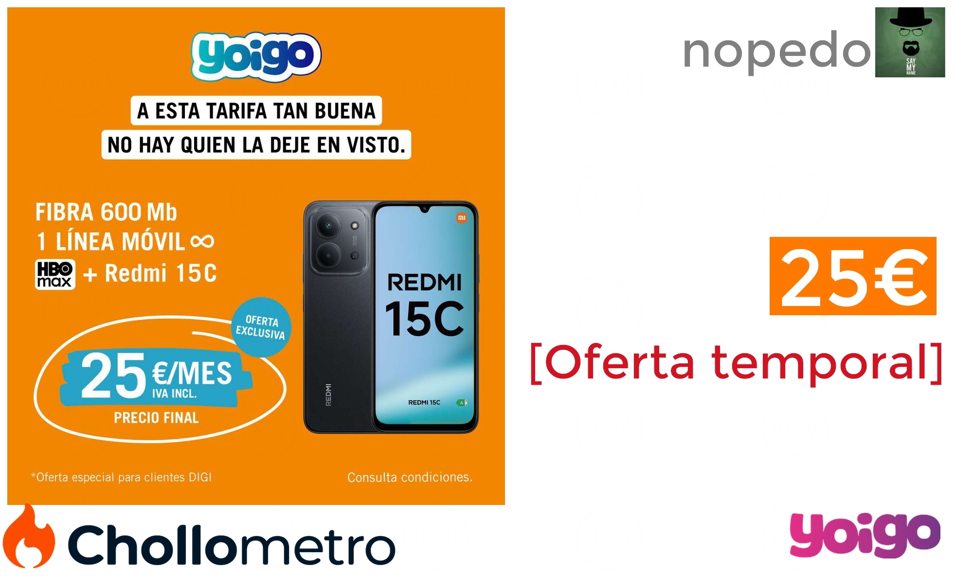 ✨Pack Yoigo fibra 600Mb, ilimitadas, HBO Max y Xiaomi 15C 5G. Para siempre, clientes Digi; instalación y router gratis.