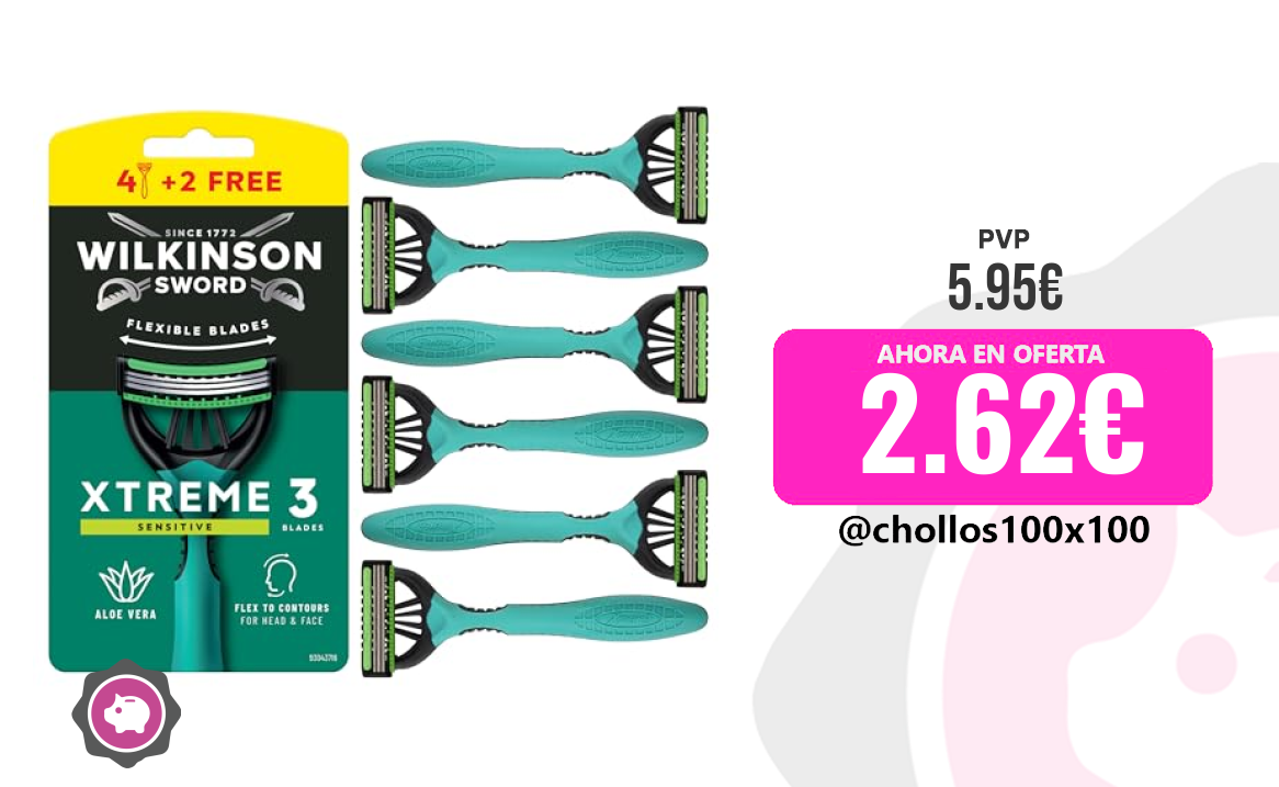 ✅ Wilkinson Sword Xtreme 3 Sensitive - Maquinillas de Afeitar Desechables con 3 Hojas Flexibles y Banda Lubricante de Aloe Vera y Vitamina E, Pack Promocional 4 + 2 Unidades