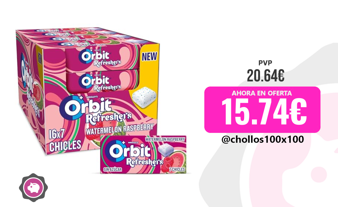 ✅ Orbit Refreshers Chicles sin azúcar sabor sandía y frambuesa, 16 paquetes de 7 unidades