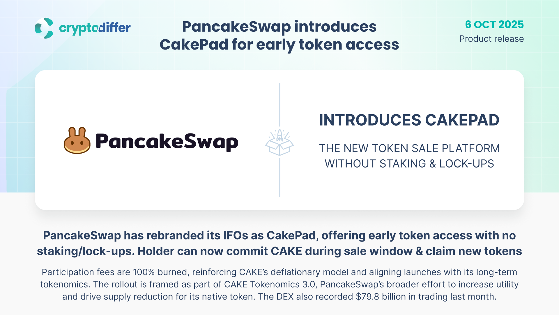 PancakeSwap has rebranded its IFOs as CakePad, offering early token access with no staking or lock-ups. Any wallet holder can now commit CAKE during the sale window and later claim new tokens. Participation fees are 100% burned, reinforcing CAKE’s deflationary model and aligning launches with its long-term tokenomics.