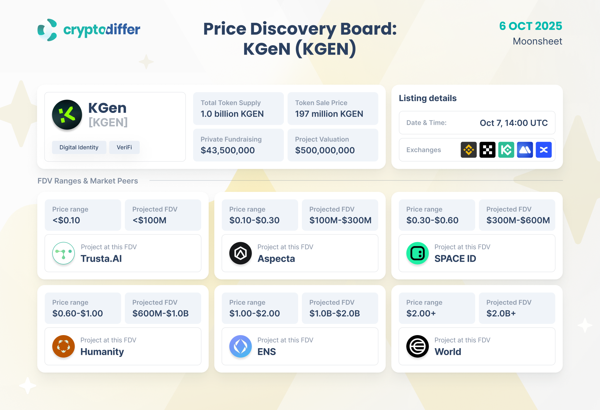 KGEN set to launch on October 7th at 14:00 UTC, backed by $43.5M in private funding. This board benchmarks potential FDV scenarios using comparable Digital Identity projects like ENS and World.