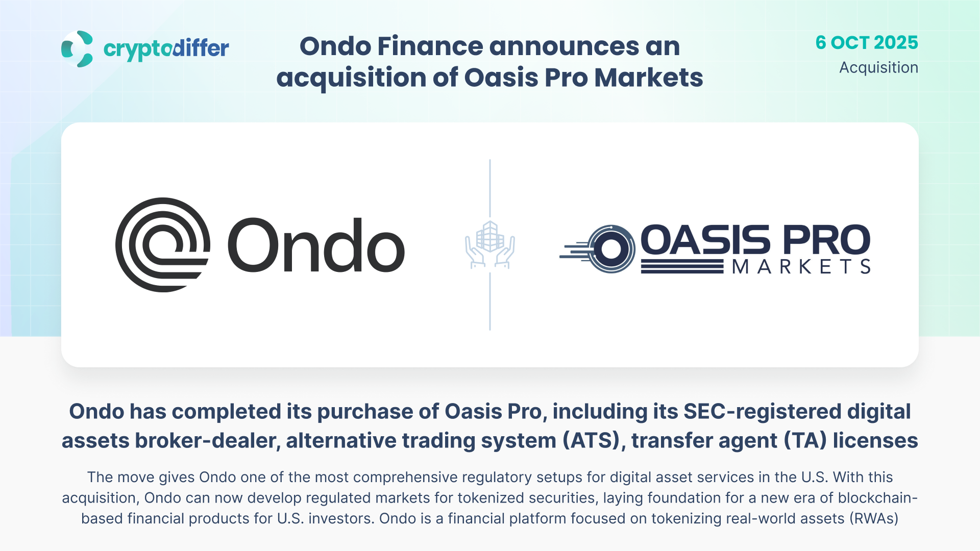 Ondo completes its acquisition of Oasis Pro Markets, securing its SEC-registered broker-dealer, ATS, and transfer agent (TA) licenses. The move gives Ondo one of the most comprehensive regulatory setups for digital asset services in the U.S.