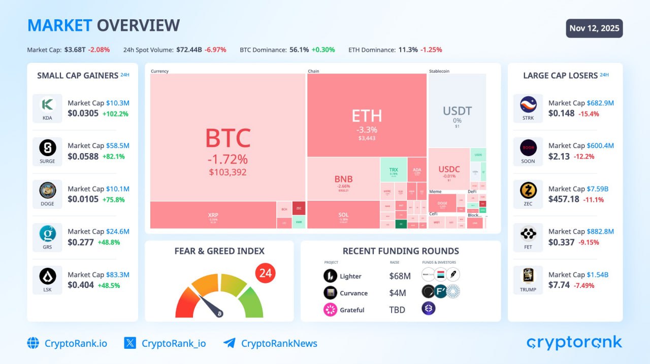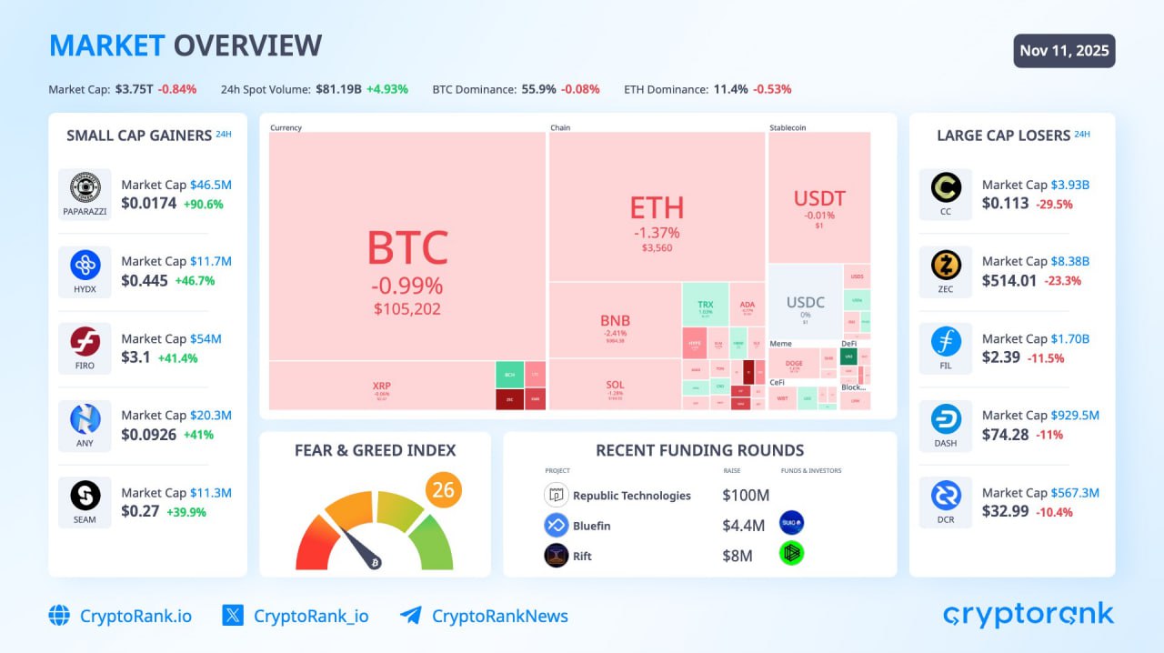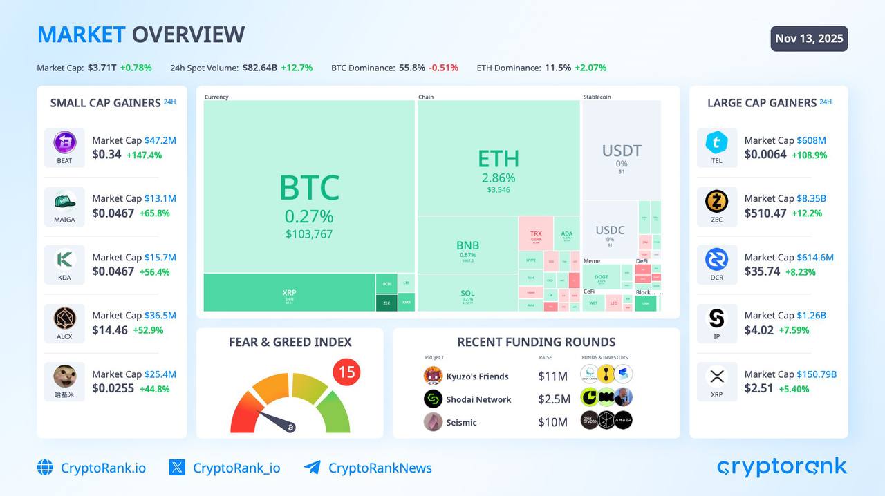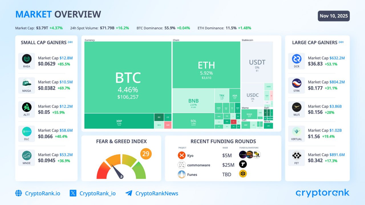 As for altcoins, privacy coins are still leading, with DCR up 48% in a day, followed by STRK gaining 32% on a protocol upgrade and Bitcoin integration. With improving sentiment, almost all coins are rising.