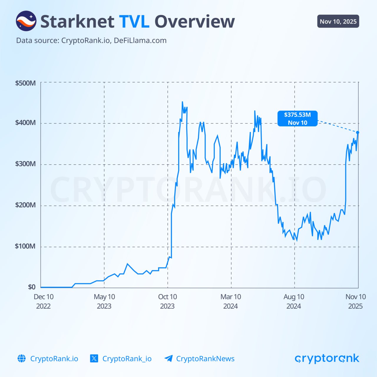 Starknet TVL nears 2024 highs as momentum returns. STRK jumps 34% in a day, ending its downtrend.