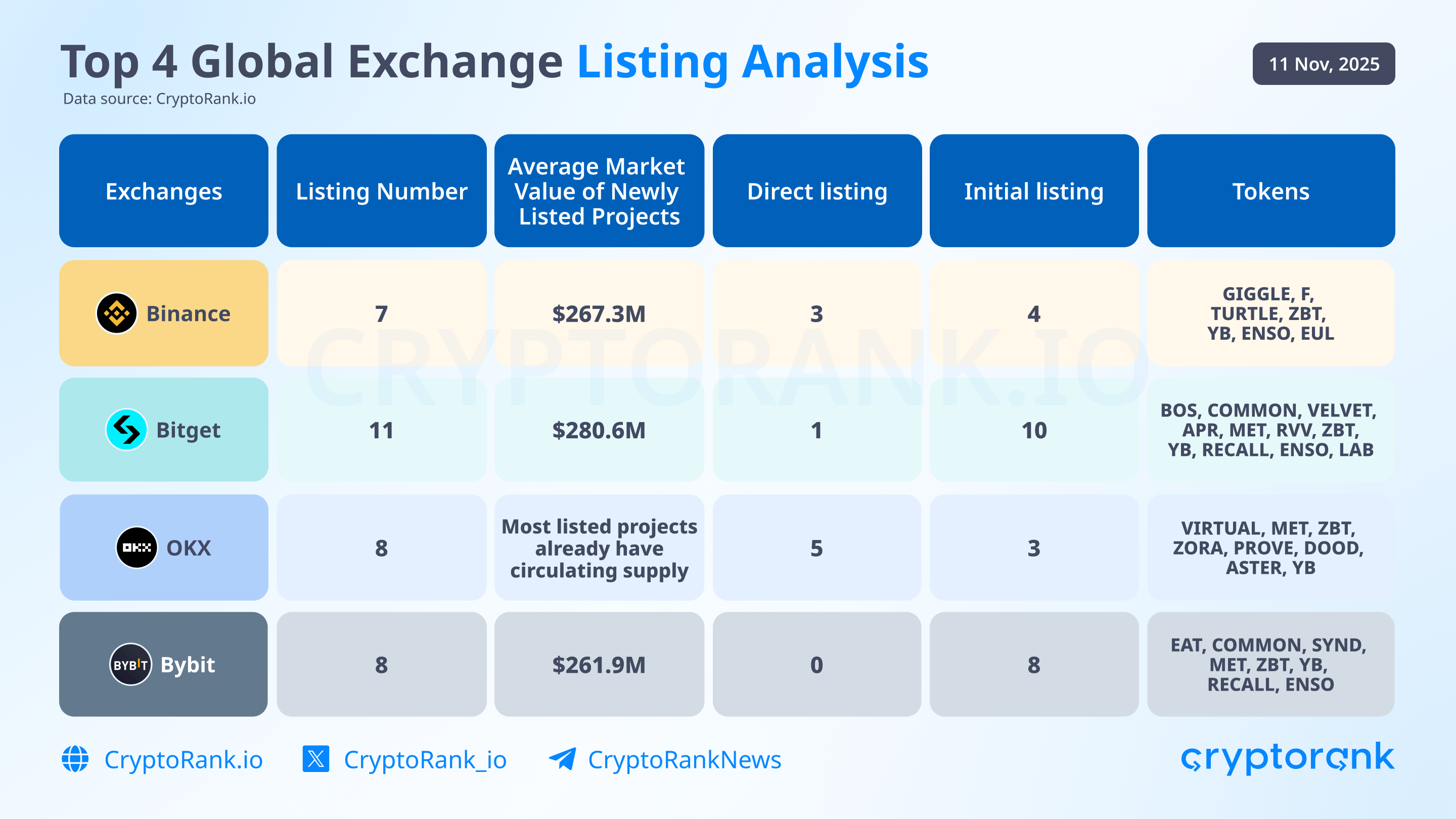Between Oct 11–31, we compared new token listings across four major exchanges: Binance, Bitget, OKX, and Bybit.