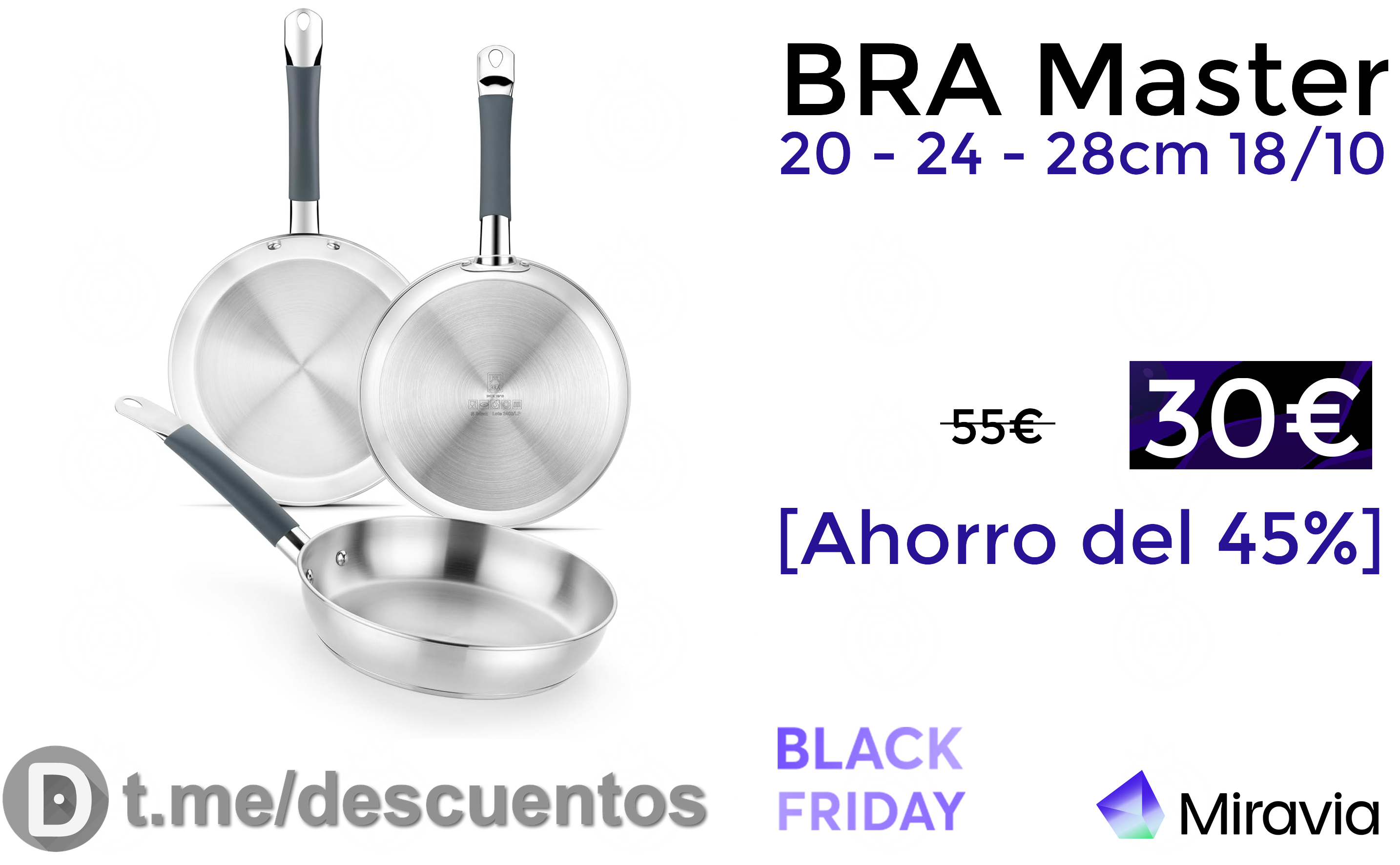 ✨Buen precio este juego de 3 sartenes de la colección BRA Master. Sartenes Acero Inoxidable 18/10 (20-24-28 cm), sin antiadherente y libre de PFAS, apto para inducción y horno y con un mango de silicona anti calor. Envío gratis.
