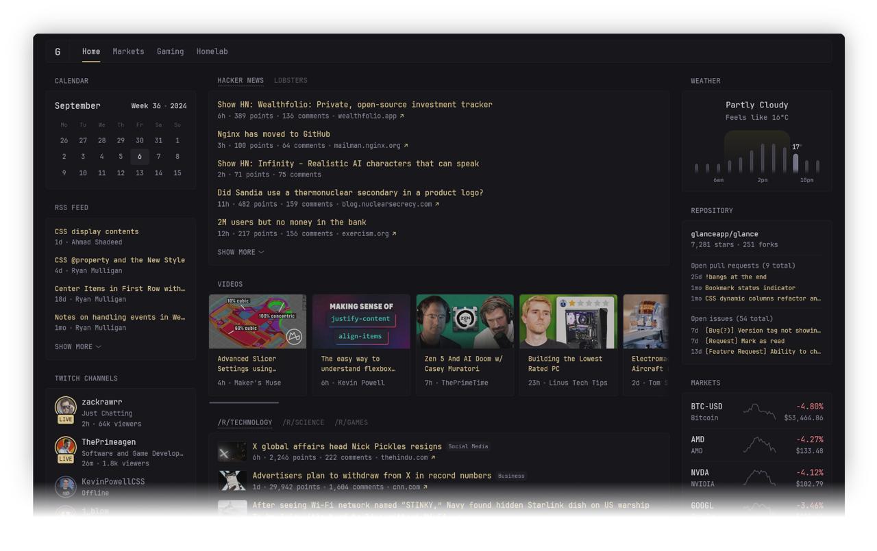 Glance - (★ 33k) is a self-hosted, lightweight, highly customizable dashboard that puts all your feeds in one place.