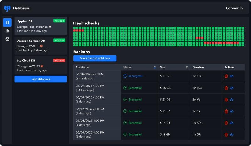 Databasus - (★ 4.8k at GitHub) is a free, open source and self-hosted tool to backup PostgreSQL, MySQL and MongoDB databases. Make backups with different storages (S3, Google Drive, FTP, etc.) and notifications about progress (Slack, Discord, Telegram, etc.)