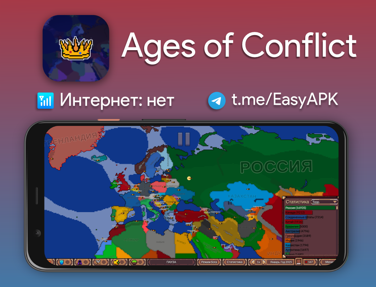 Ages of Conflict — это универсальная игра-симулятор карты, в которой вы создаете и наблюдаете, как пользовательские нации ИИ сражаются в бесконечном количестве миров. Командуйте нациями, чтобы подтолкнуть мировые события по своему вкусу. #games @EasyAPK