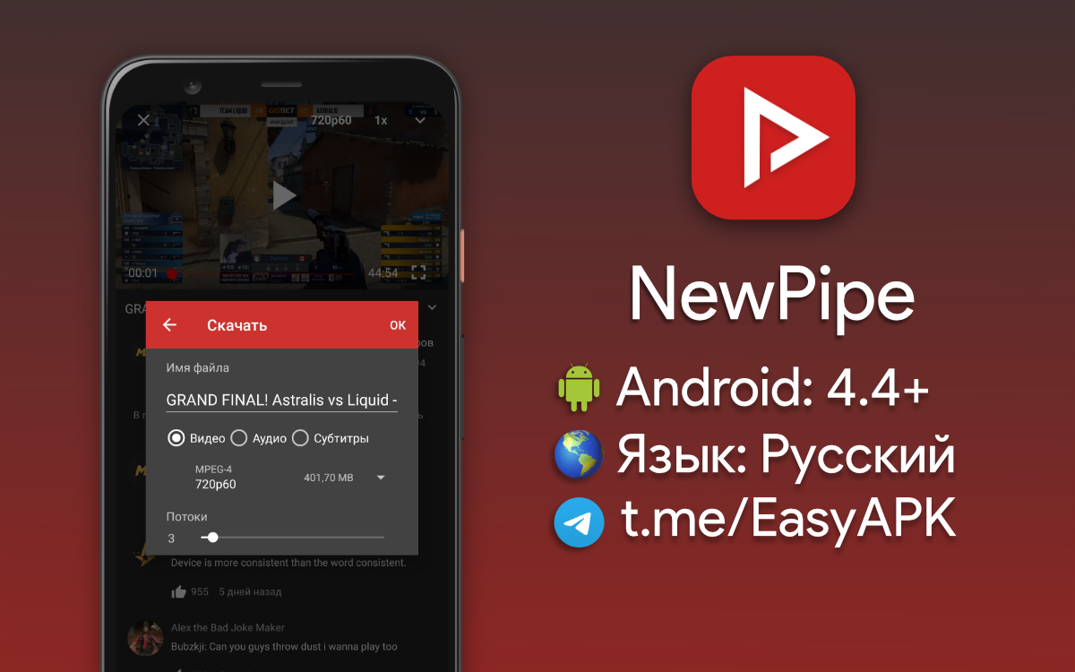 NewPipe — сторонний клиент для YouTube. Умеет играть видео в фоне и скачивать ролики в любом качестве. Требует намного меньше ресурсов, чем оф. YouTube. #apps @EasyAPK