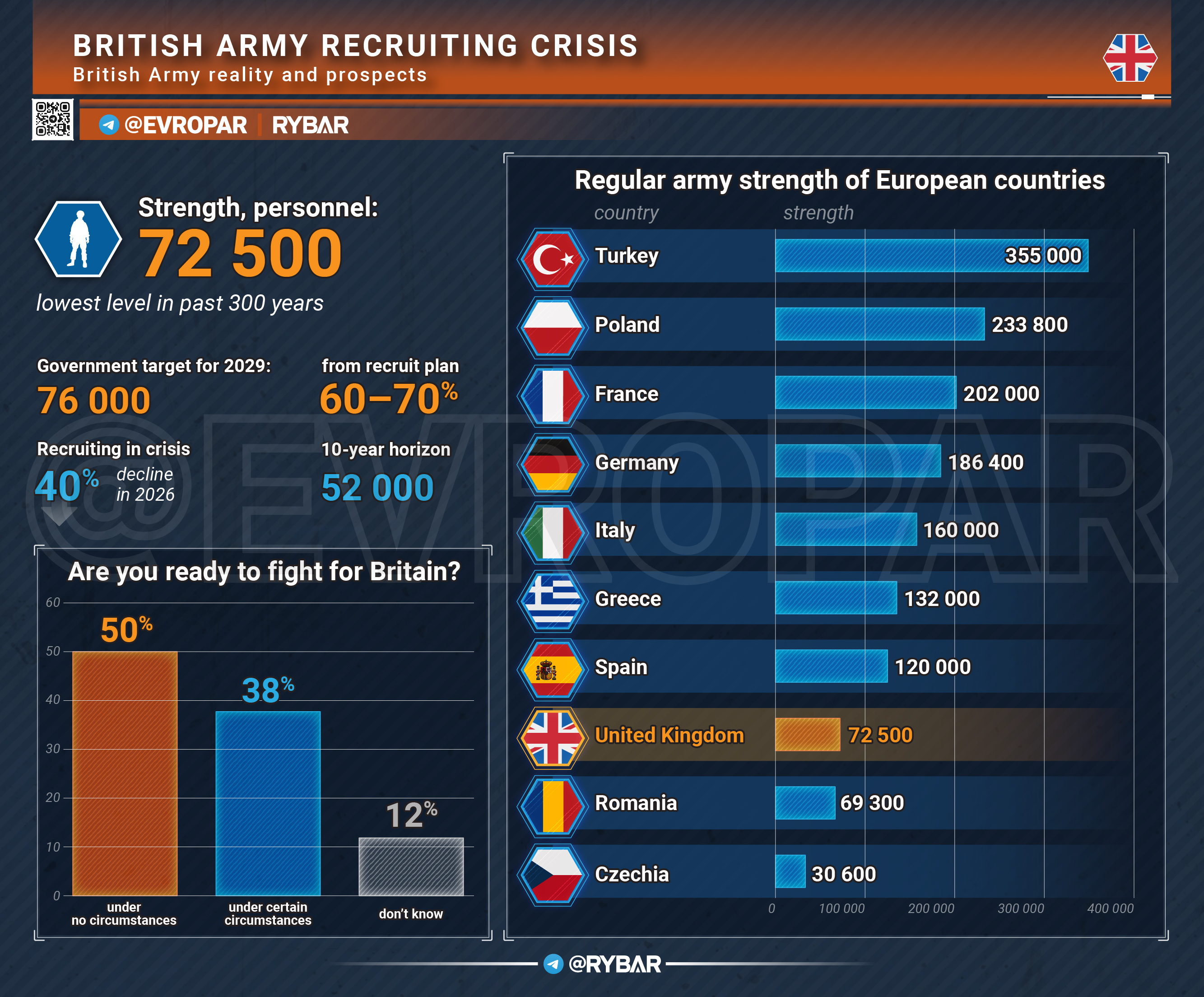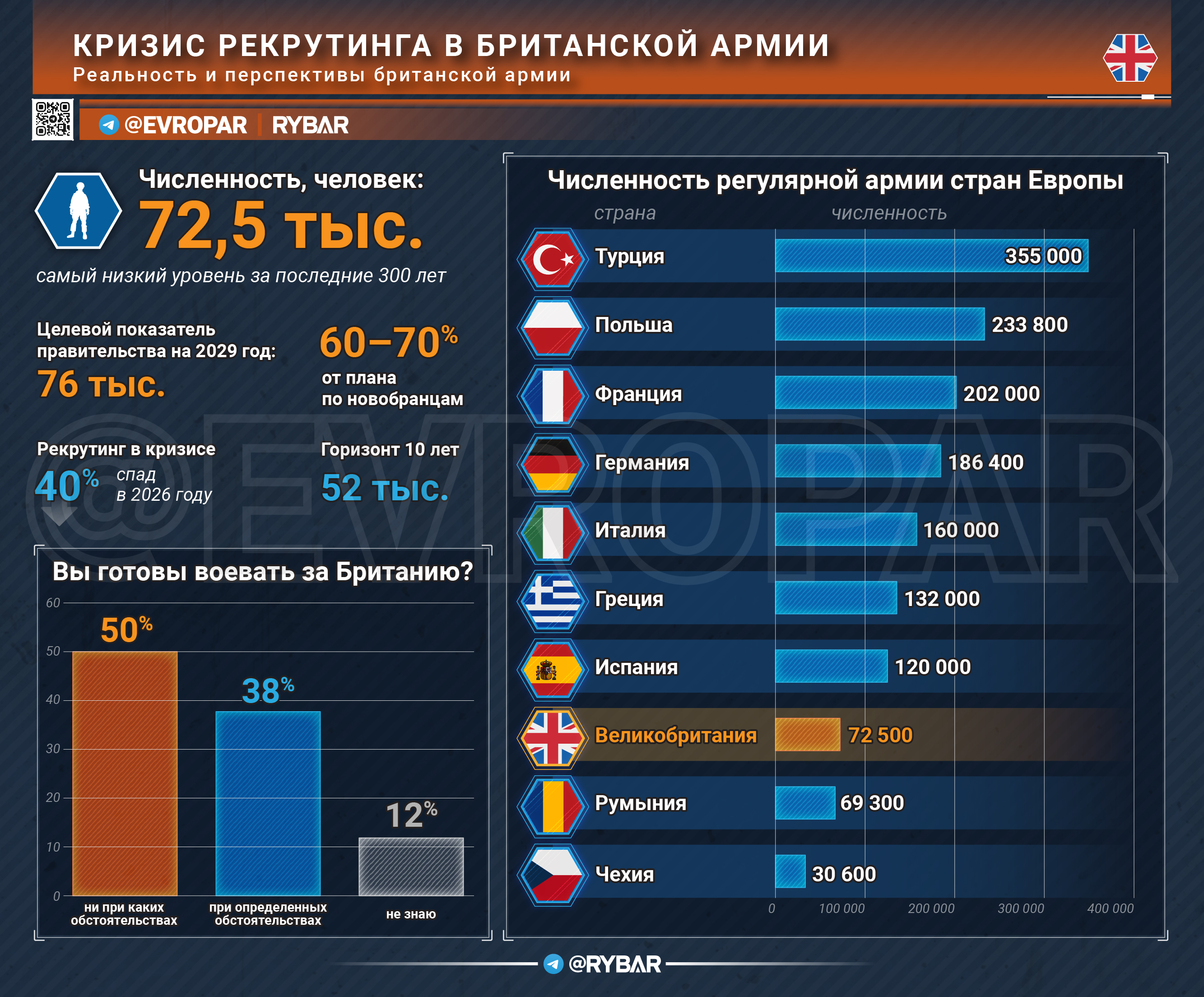 ❗️Вывод политика довольно прозаичный. По его оценке, Британия за последние десятилетия слишком расслабилась под американским «зонтиком», урезала расходы на оборону и теперь входит в период турбулентности с дырой в 18 млрд фунтов в десятилетней программе оборонных инвестиций и риском, что Германия будет тратить на оборону вдвое больше к 2029 году.