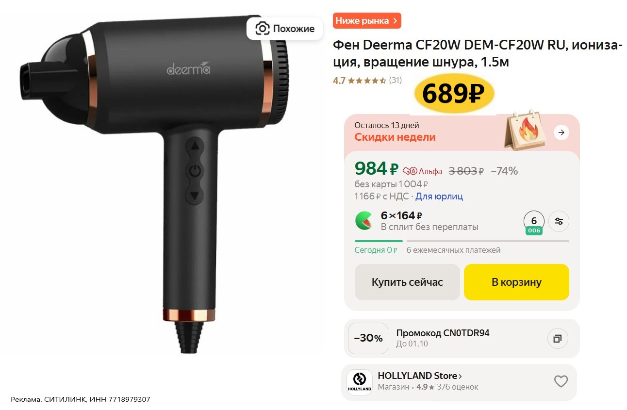 за 689₽. Мощность 1600 Вт, имеет 3 температурных режима, 2 скорости, насадку-концентратор и магнитную подвеску для хранения.