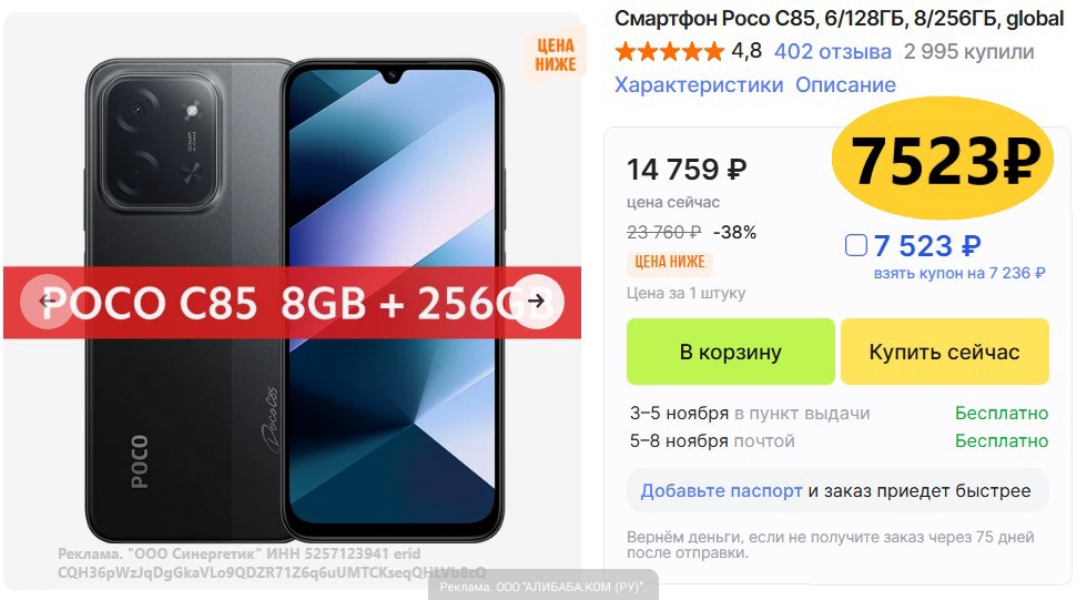 • Смартфон POCO C85, 8/256 Гб за 7523₽ с купоном продавца 3618₽. Экран 6.9"с разрешением 1600x720 пикс, процессор MediaTek Helio G81-Ultra, аккумулятор на 6000 мАч.