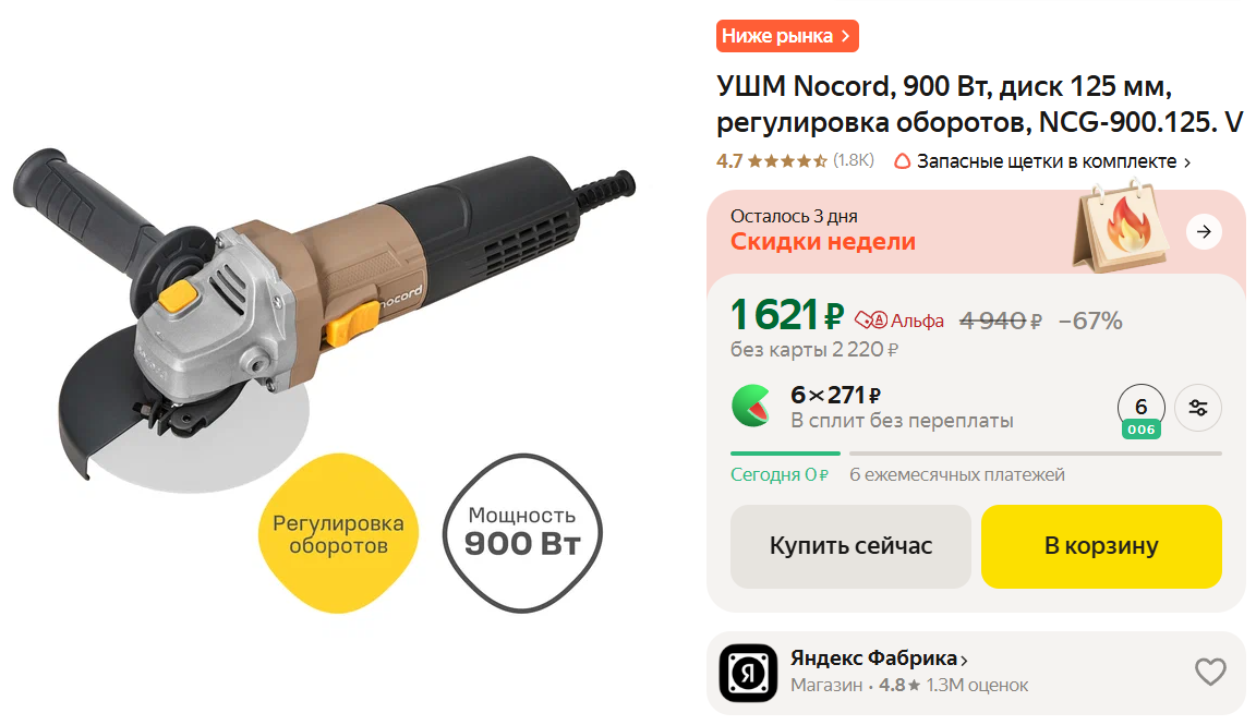• УШМ Nocord, 900 Вт за 1621₽. Компактный корпус с дополнительной рукоятью, мощность 900 Вт, частота вращения диска до 11000 об/мин, фиксация шпинделя, быстросъёмный кожух.