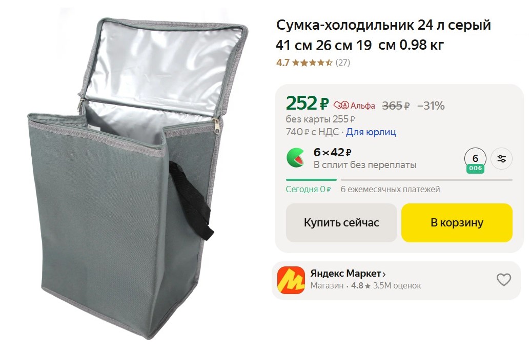 • Сумка-холодильник за 252₽. Объём 24 л, размеры 41х26х19 см, внутри всё герметично и легко моется. В комплекте три аккумулятора холода.