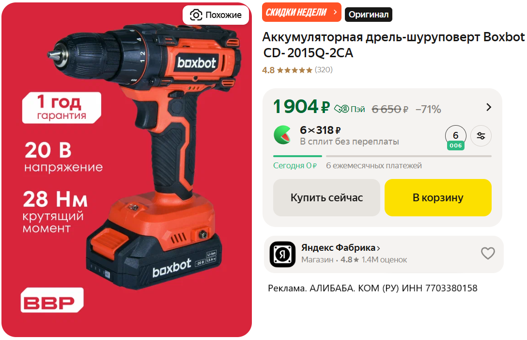 • Аккумуляторная дрель-шуруповёрт Boxbot CD-2015Q-2CA за 1904₽. Крутящий момент 28 Н·м, быстрозажимной патрон, скорость до 1350 об/мин, в комплекте 2 аккумулятора, биты, свёрла, переходник и кейс.