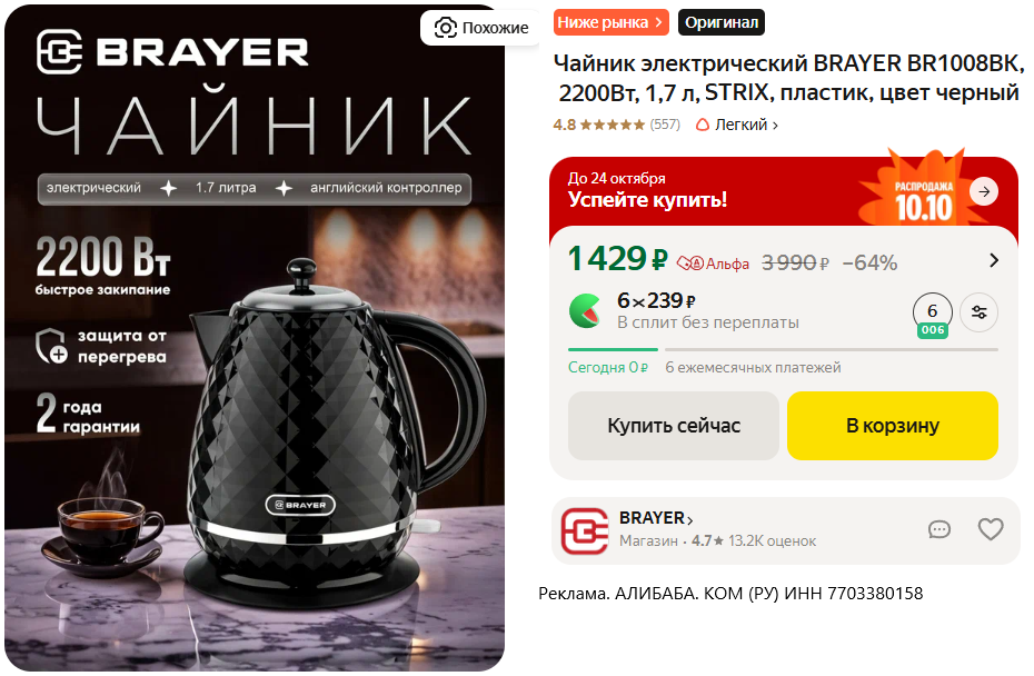 • Чайник электрический BRAYER BR1008BK за 1429₽, везде от 1823₽. Мощность 2200 Вт, объём 1.7 л, термостойкий пластиковый корпус, встроенный фильтр от накипи.