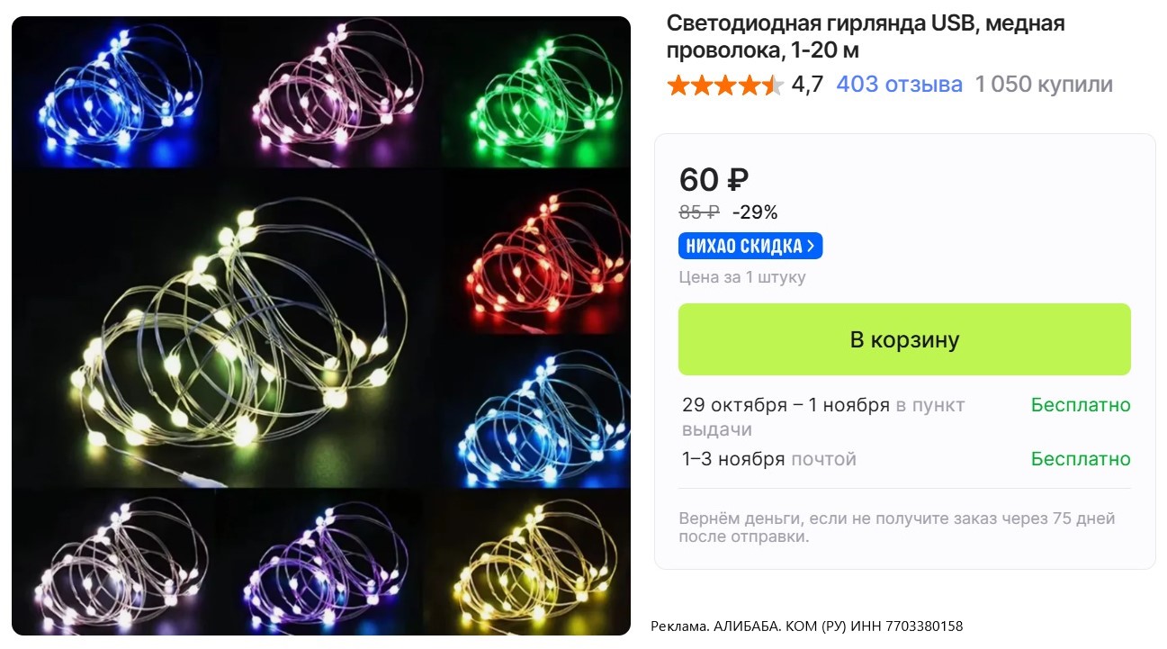 • Светодиодная гирлянда USB от 60₽. Медный кабель, отлично подойдёт в качестве декора. Можно выбрать цвет свечения и дину от 1 до 20 м.