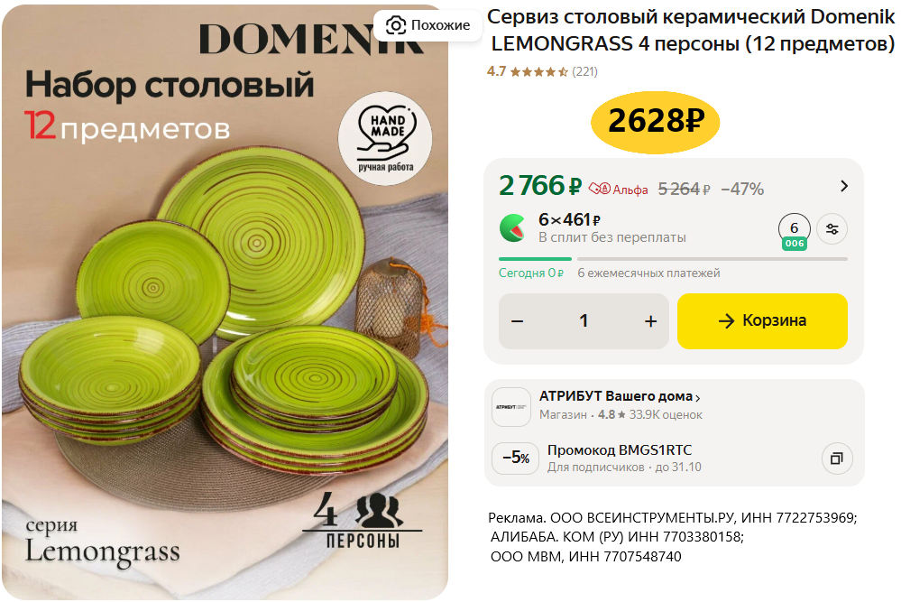 • Сервиз столовый керамический Domenik LEMONGRASS за 2628₽ с кодом: BMGS1RTC