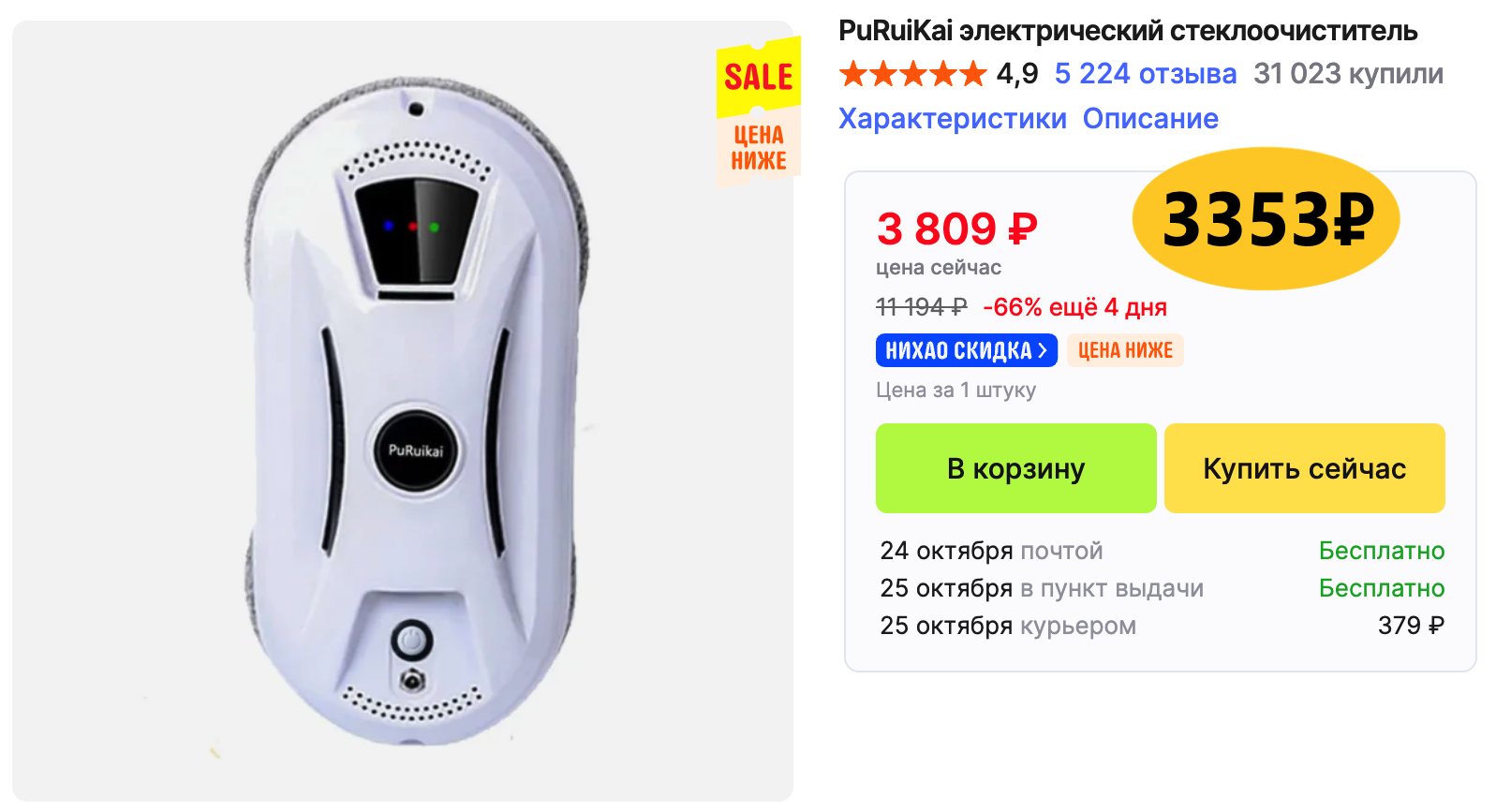 • Мойщик окон PuRuiKai за 3353₽ с купоном продавца на 456₽. Сила всасывания 5600 Па,, есть резервный аккумулятор. В наборе 10 сменных насадок из микрофибры, пульт и страховочный трос.