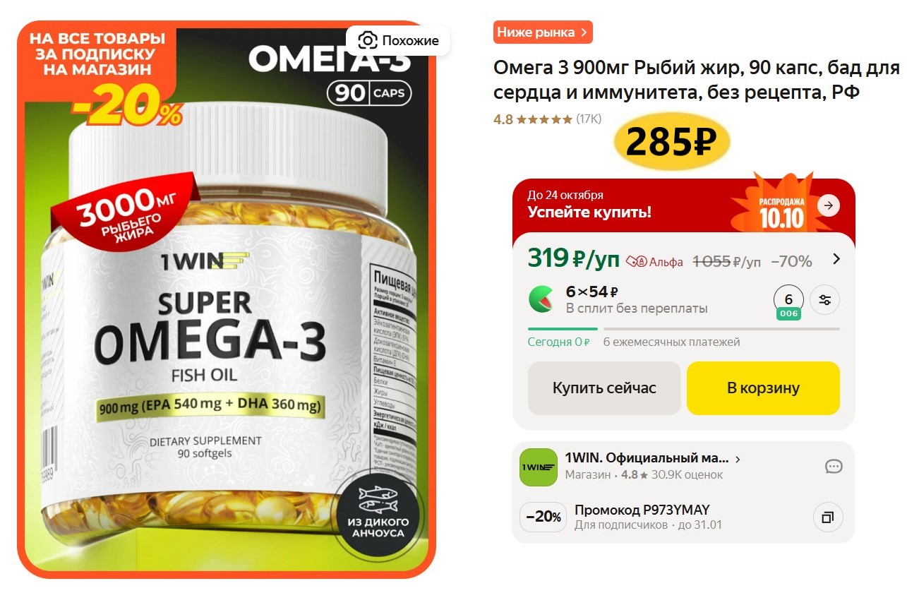 • 1WIN Омега 3 900 мг Рыбий жир, 90 капс. за 285₽ с кодом: P973YMAY